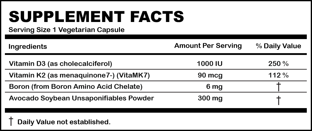 ASU (Avocado/Soybean Unsaponifiables) is derived from avocados and soybeans and has been shown in laboratory research to inhibit components that result in cartilage breakdown. ASU is one of the most effective natural ingredients for cartilage health, plus ample potencies of vitamin K, vitamin D3 and boron.