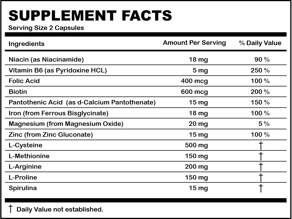 This product contains most of the essential nutrients and minerals for keeping hair, Skin and nails healthy. L-Cysteine stabilizes protein structure and aids in the formation of collagen, thereby promoting healthy skin, hair and nail texture and elasticity. Another component is L-Arginine, an essential basic amino acid involved in increasing circulation by relaxing blood vessels. L-Methionine is also able to convert methionine to cysteine which acts as a precursor to L-Glutathione. L-Proline amino acid is essential for synthesizing collagen, the most abundant protein in mammals.